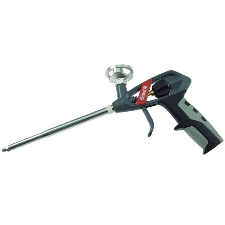 Pistolet à mousse ergonomique en aluminium BEAST, conçu pour un usage professionnel dans les travaux de construction, de montage, d’isolation et de finition. La buse du pistolet est en laiton. Corps en aluminium et mécanisme de détente en acier avec réglage. Douille filetée en métal pour l’insertion de canettes de mousse. Grand bouton ergonomique pour réguler le débit de mousse. Il dispose d’un mécanisme qui empêche le reflux de la mousse et le colmatage du pistolet, et empêche le déversement de mousse. Large plage de travail – longueur tube métal : 19cm.