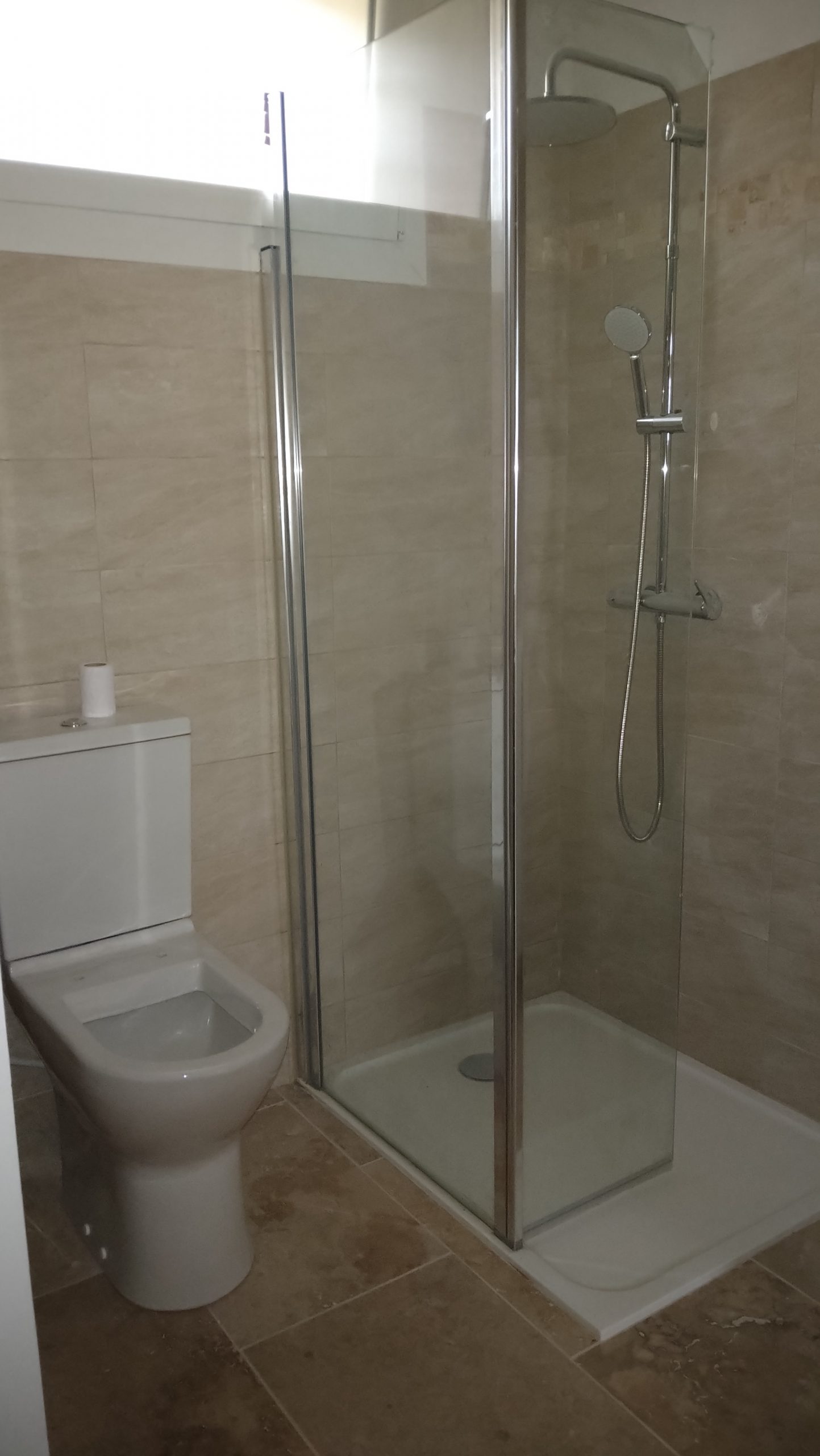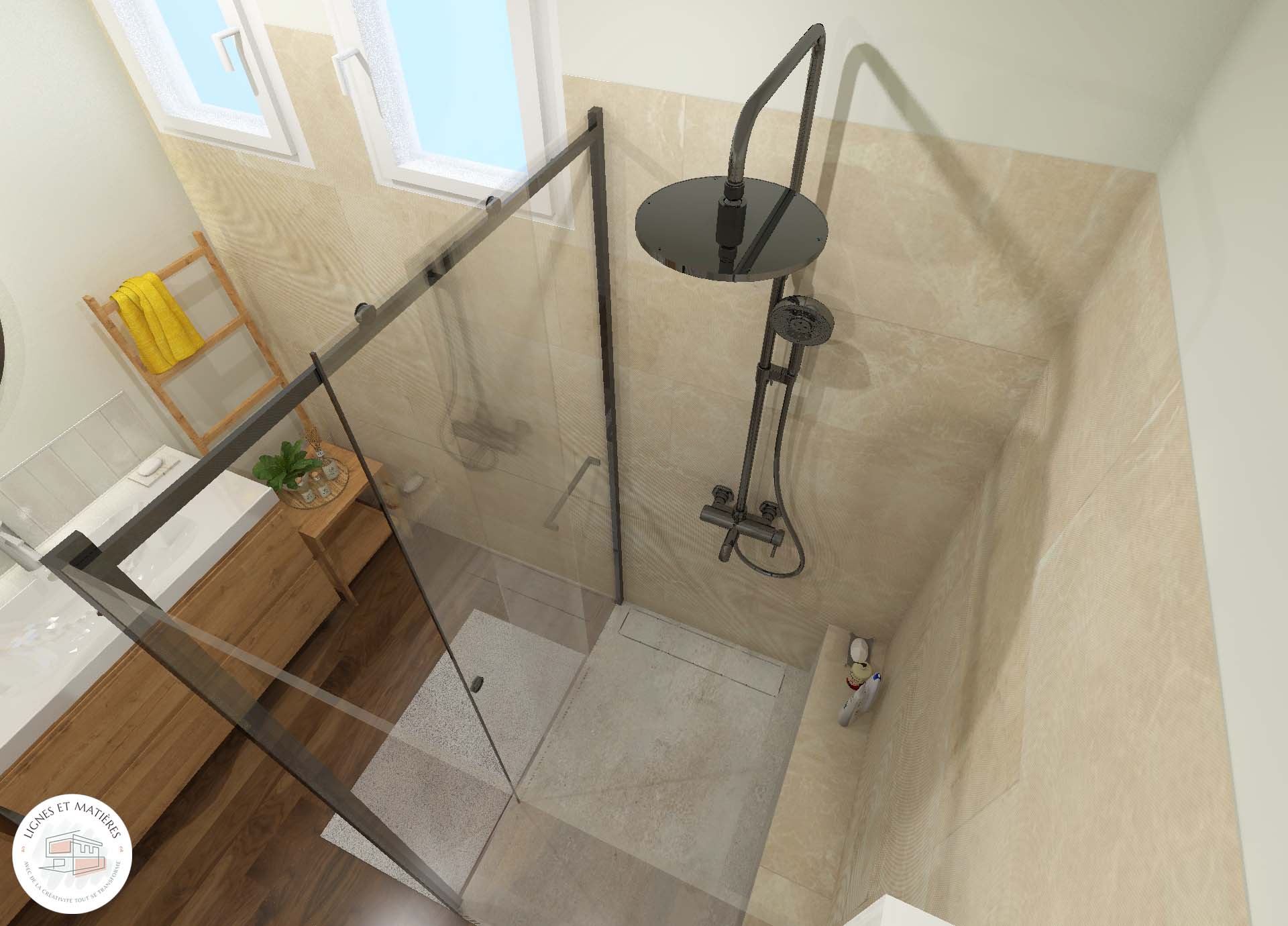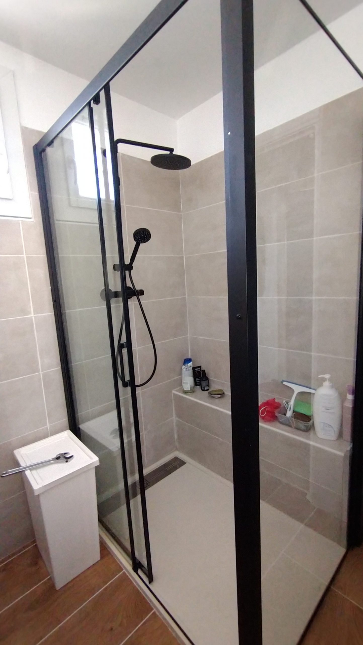 Nous avons repensé cette salle de bain pour allier modernité et praticité. Exit la petite douche d’angle vieillotte : place à une grande douche type italienne avec banc intégré, une robinetterie noire élégante et un meuble vasque fonctionnel. Les matériaux ont été choisis pour leur esthétique et leur durabilité : carrelage effet bois au sol et carrelage beige effet pierre pour une ambiance chaleureuse et intemporelle. Le résultat ? Une salle de bain élégante, minimaliste et facile à entretenir !